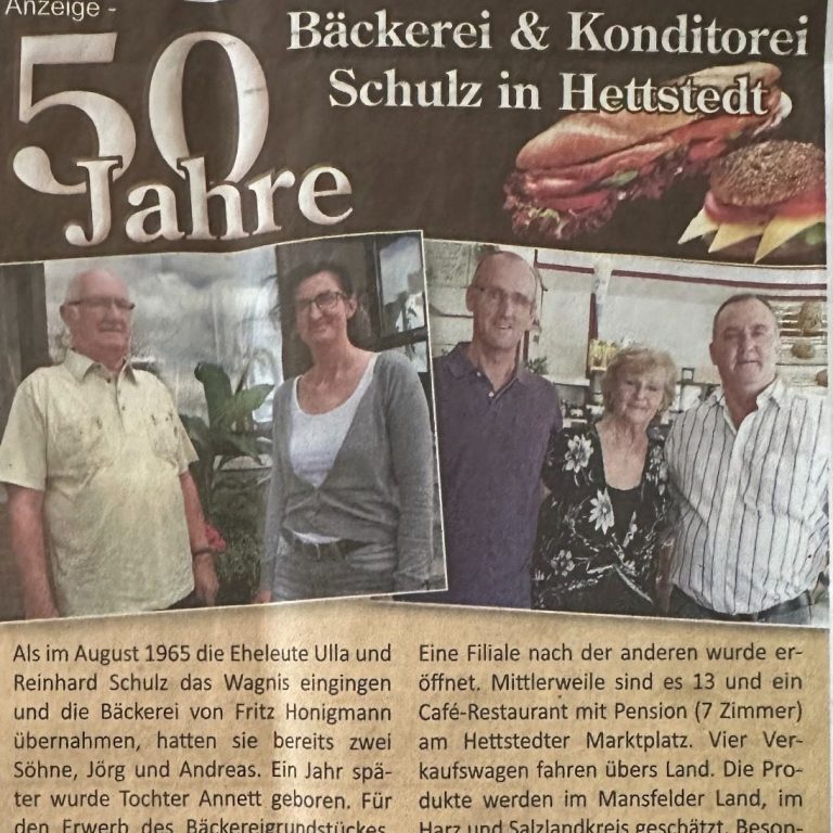 Die Bäckerei und Konditorei Schulz wurde 1965 in Hettstedt gegründet. Reinhard Schulz begann seine Lehre bei Bäckermeister Fritz Honigmann.